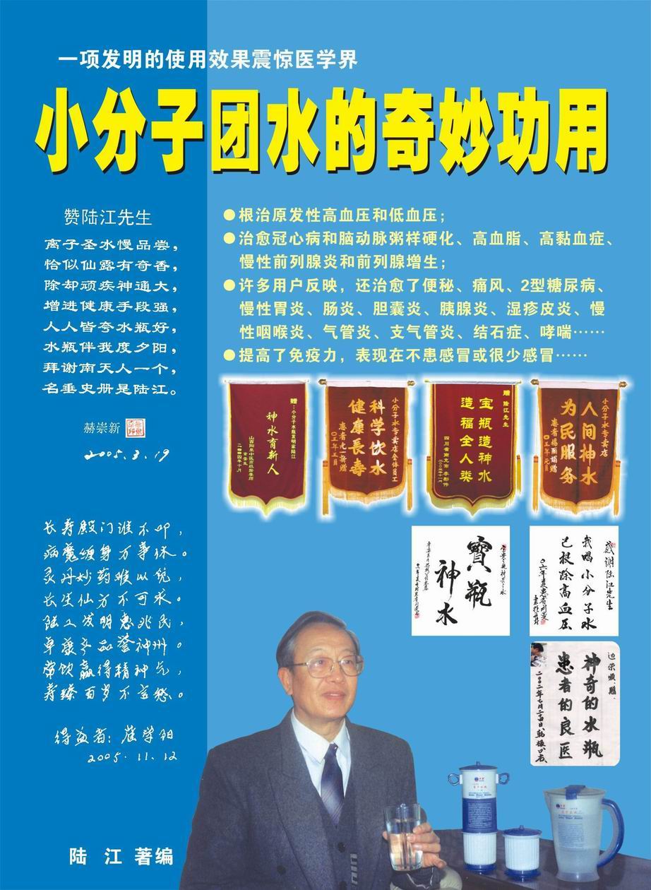 人類幾千年來(lái)患以上病癥需終生服藥,幾十年也不能治愈??墒俏覈?guó)南寧的高級(jí)工程師陸 江,于1990年想根治高血壓,研究發(fā)明了離子水瓶,處理出微小分子團(tuán)水供飲用,經(jīng)過(guò)醫(yī)院臨床試用和專家鑒定,1999年獲中國(guó)發(fā)明專利權(quán),產(chǎn)品于2000年投放市場(chǎng)后一直跟蹤調(diào)查,據(jù)全國(guó)各地用戶反饋:祛除了高低血壓、糖尿病和冠心病,并使前列腺增生、咽喉炎、鼻竇炎、慢性氣管炎、支氣管炎、矽肺病、哮喘、慢性胃炎、腸炎、慢性膽囊炎、慢性腎炎、腎衰、膀胱炎、便秘、痔瘡、風(fēng)濕性關(guān)節(jié)炎和濕疹皮炎及中風(fēng)后遺癥等病癥不藥而愈。為什么喝微小水能治20多種病?陸 江從1991年德國(guó)科學(xué)家發(fā)現(xiàn)細(xì)胞膜水通道僅為2納米獲得啟發(fā),認(rèn)為多種器官患病是因細(xì)胞脫水,不能正常代謝和分裂增殖,才使器官細(xì)胞減少致衰弱萎縮而形成細(xì)胞缺水性病癥。22年來(lái)的實(shí)踐有力地支持了“細(xì)胞脫水致病”這一重要論點(diǎn),表明喝微小水可滿足細(xì)胞的生理需求,補(bǔ)水就能祛病,是生命科學(xué)新亮點(diǎn)。